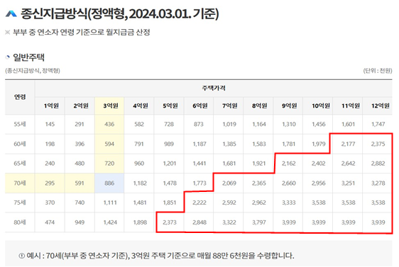 둘째, 2024년 기준 최저임금 기준 월급인 206만 740원(시간당 9,860원 기준)보다 높게 받을 수 있는 연령층과 공시가격을 알 수 있습니다. 내 아파트 공시가격이 8억 원이면 70세 기준 매월 236만 5천 원을 받습니다. 일하는 시니어들인 60세를 기준으로 보면 공시가격 11억 원이면 217만 7천 원을 받습니다.
