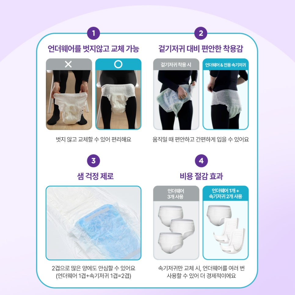 언더웨어를 벗지 않고 속기저귀만 갈아끼우면 되므로