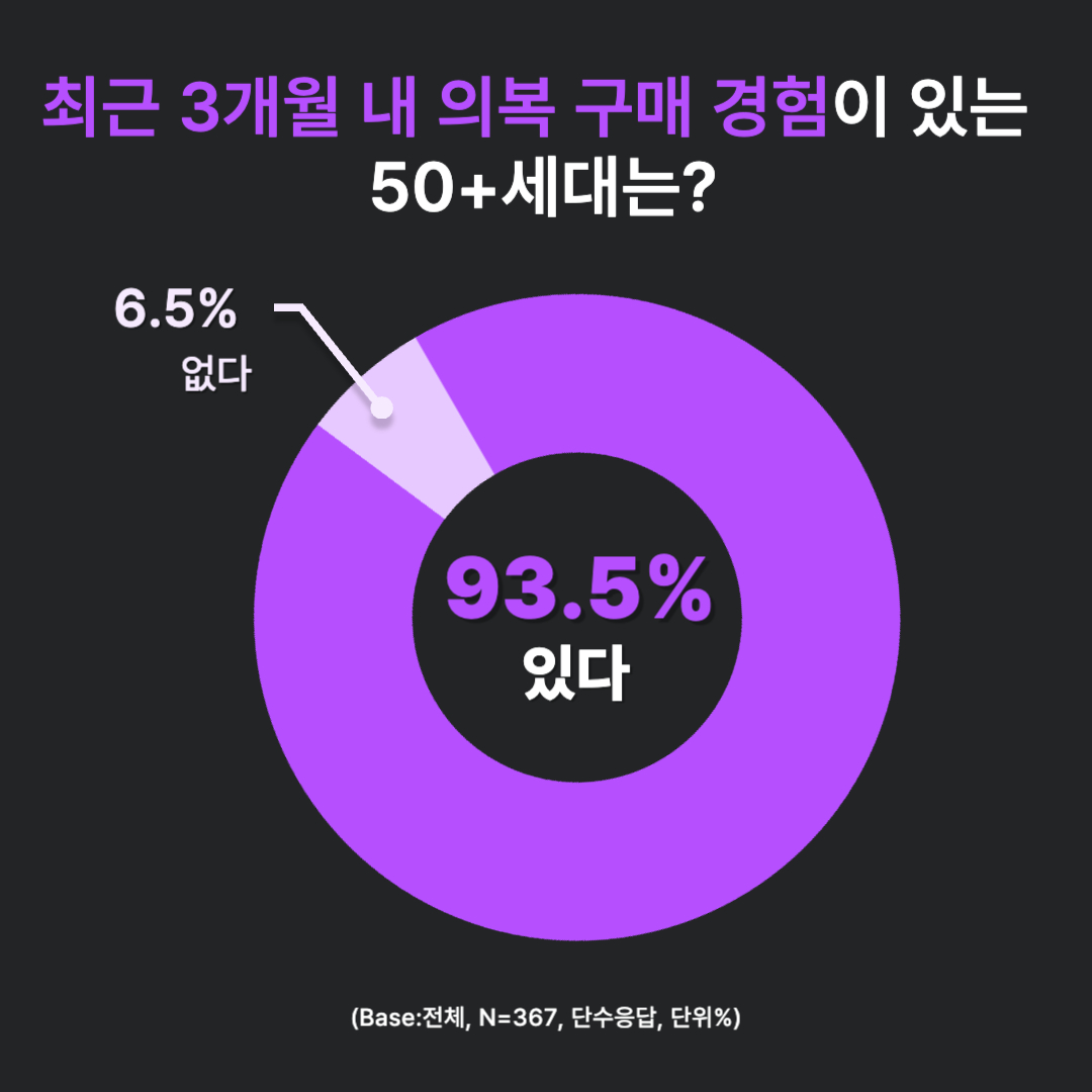 367명의 A세대 응답자를 대상으로 '최근 3개월 내 의복을 구매한 경험'을 묻자, 93.5%의 응답자가 '있다'고 응답했습니다.