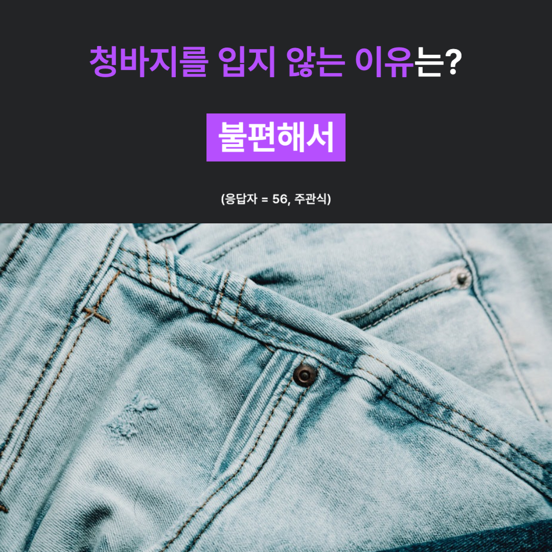 청바지를 입지 않는 56명을 대상으로 '청바지를 입지 않는 이유'에 대한 주관식 문항에서는 '불편해서'라는 응답이 1위를 차지하였습니다.