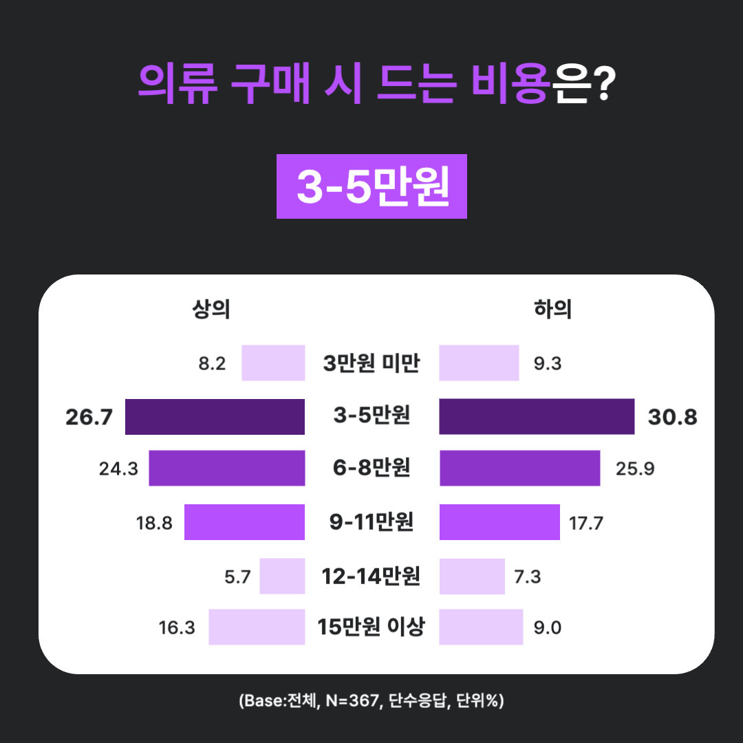 하의 구매 시 드는 비용'에 대한 질문에서도 30.8%의 응답자가 '3-5만원을 선택하며 상의와 동일한 결과가 나왔습니다. 상하의 결과 모두 2위는 '6-8만원, 3위는 '9-11만원'이 차지하였습니다.